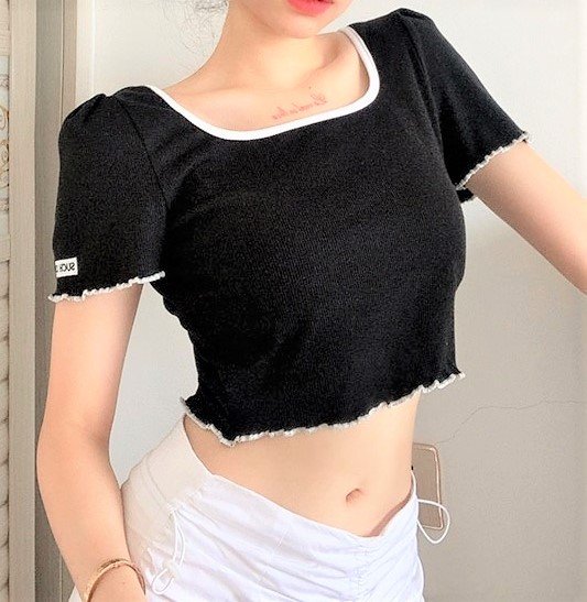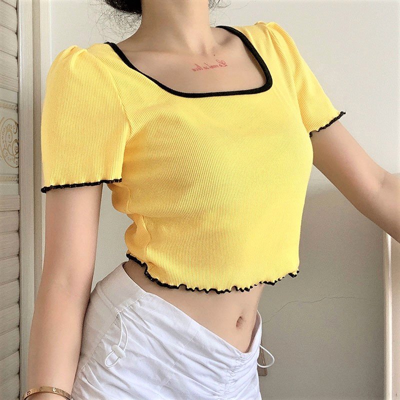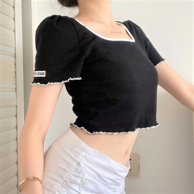 Vintage Chic Ribbed Knit Lettuce Hem Short Sleeve Sexy Slinky Crop Top 90s Y2K Party Dancing Occasion Streetwear Amazing