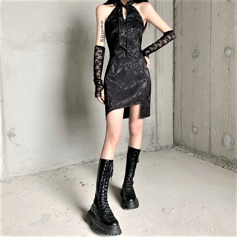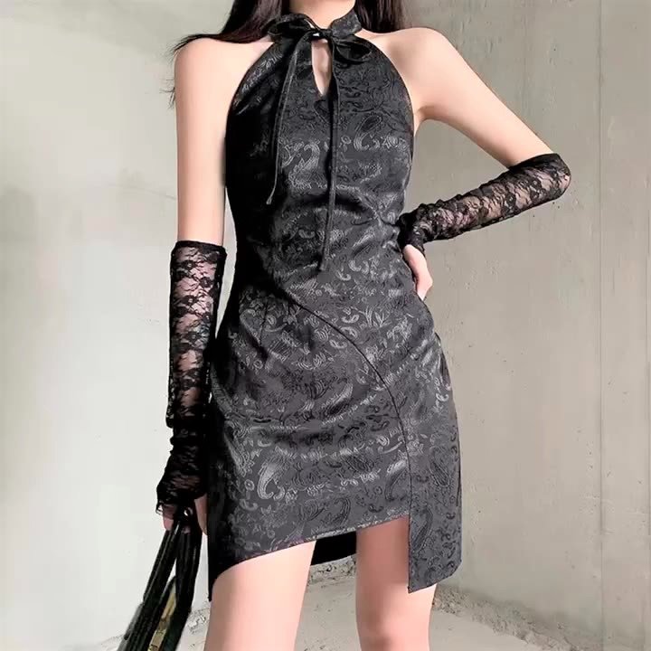Stunning Vintage Irregular Drawstring Keyhole Neck Patchwork Paisley Floral Embroidery Detachable Lace Crochet Sleeve Gloves Flattering Halter Dress 90s Y2K Cocktail Party Nightclub Evening Occasion Amazing
