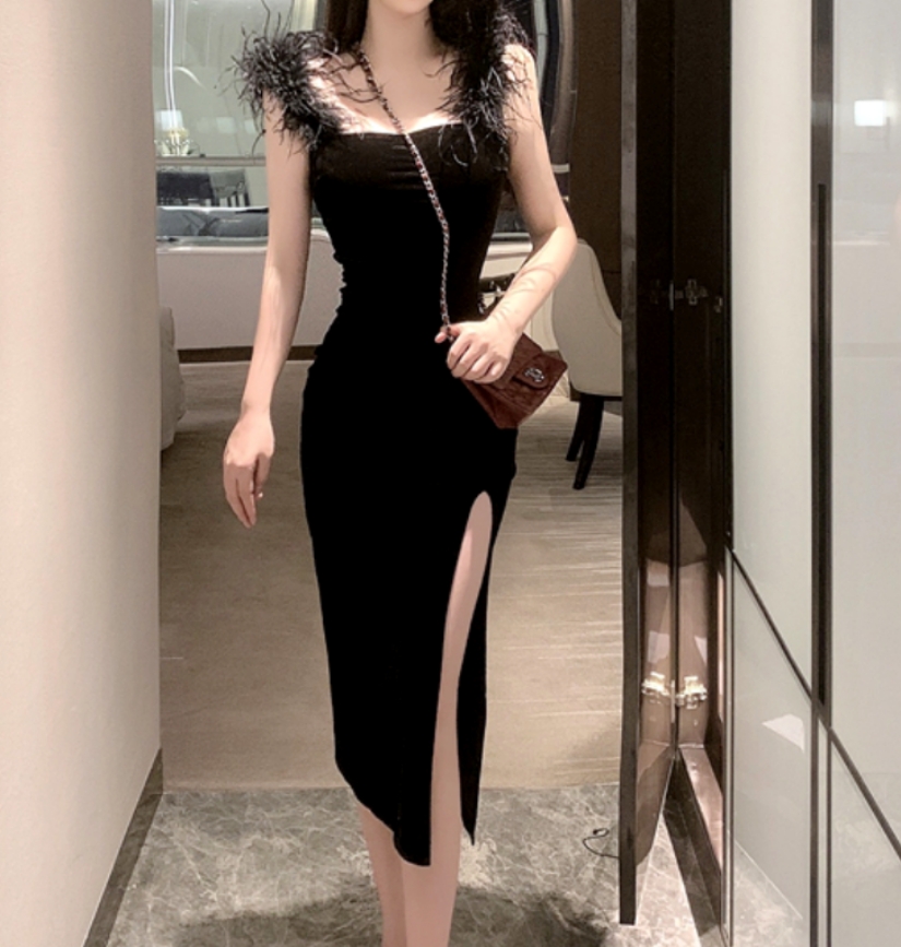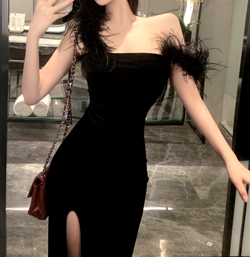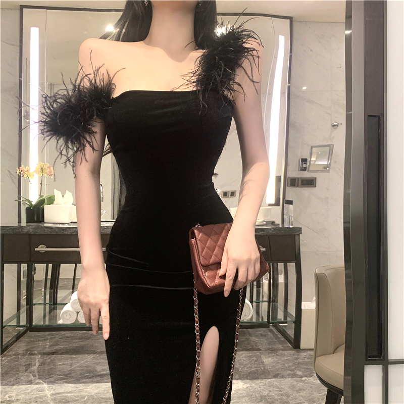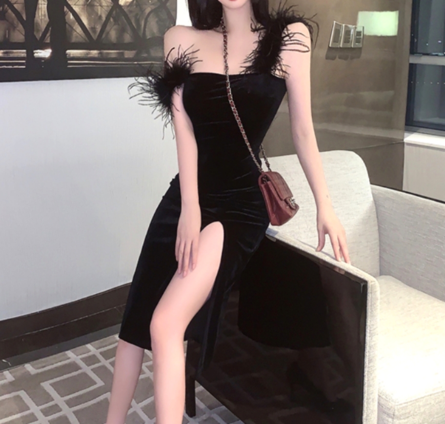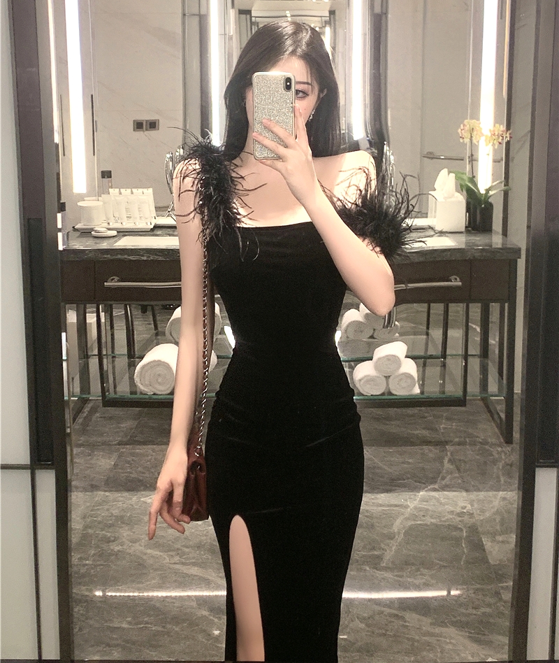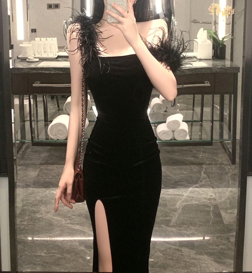 Gorgeous Vintage Velvet Furry Shoulder Straps Push Up Bustier Neckline Back Zipper High Slit Bodycon Maxi Dress
