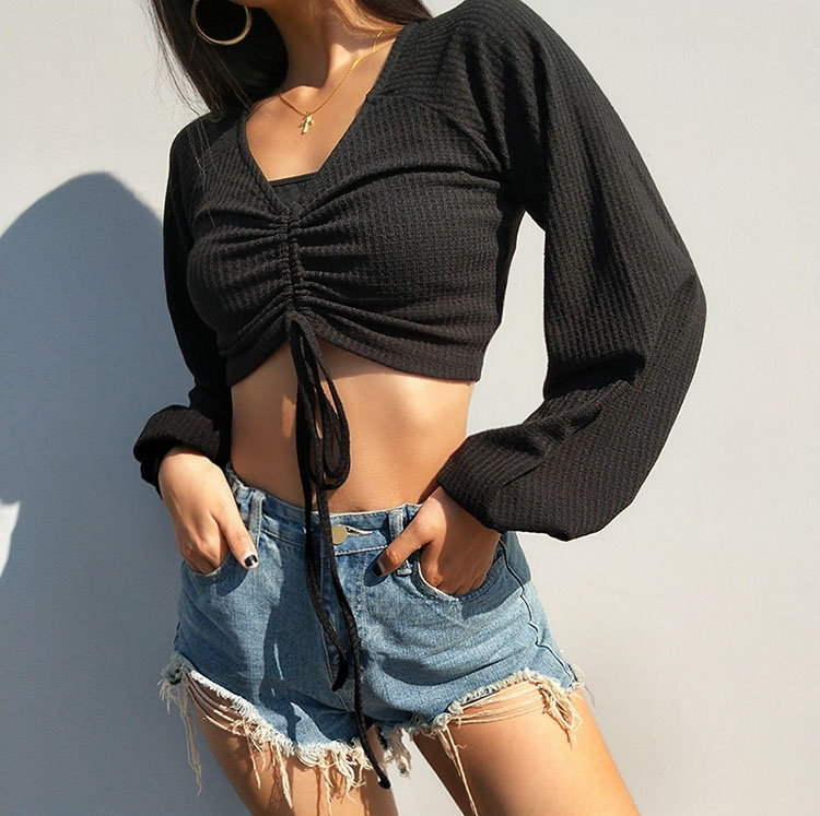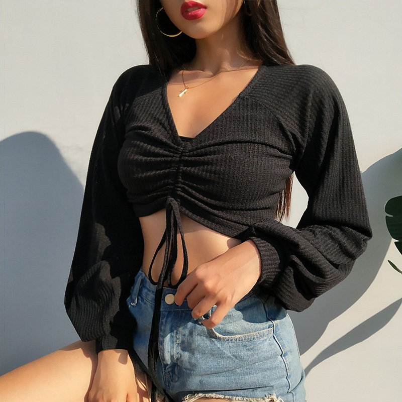 Vintage Adorable Drawstring Tie V-neck Lantern Puffy Sleeve Ruched Ruffle Push Up Bustier Flattering Crop Top 2000s Y2K Amazing