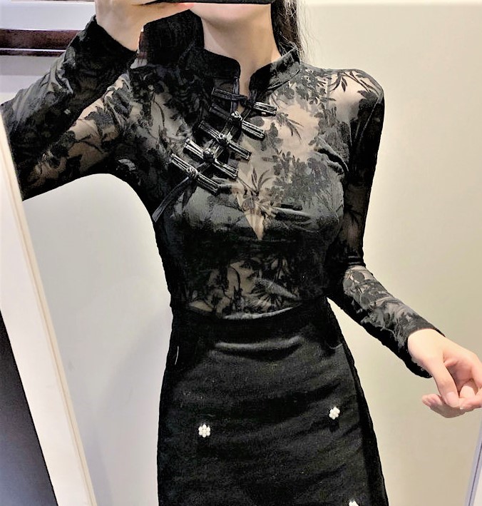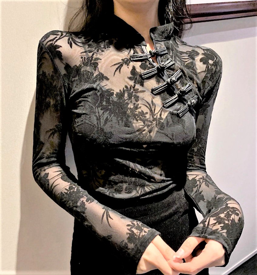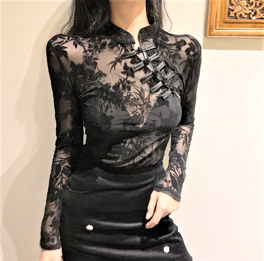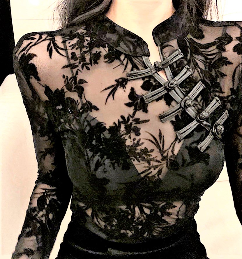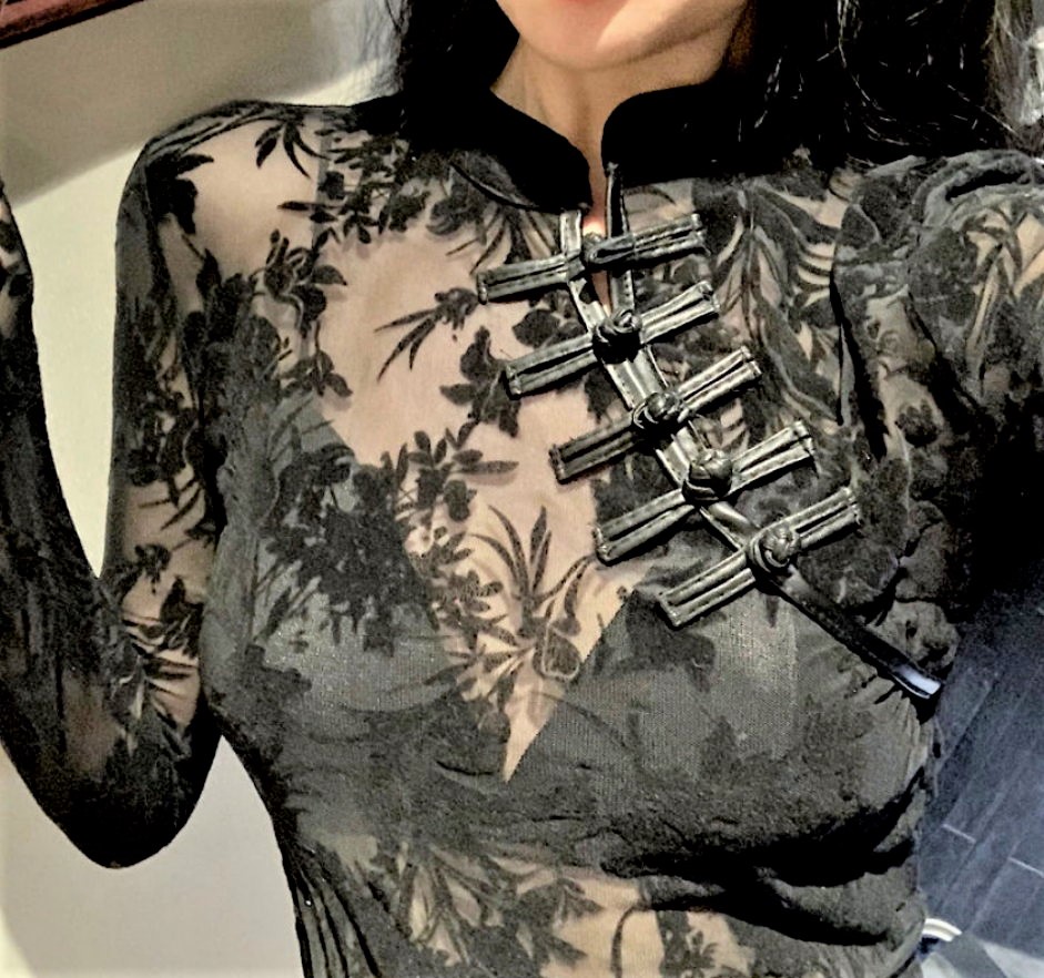 Vintage Mesh Lace Floral Embroidery Faux Leather Side Straps Buckle Details See Through Sexy Slinky Blouse Tops Y2K 90s Highstreet Party Dance Amazing