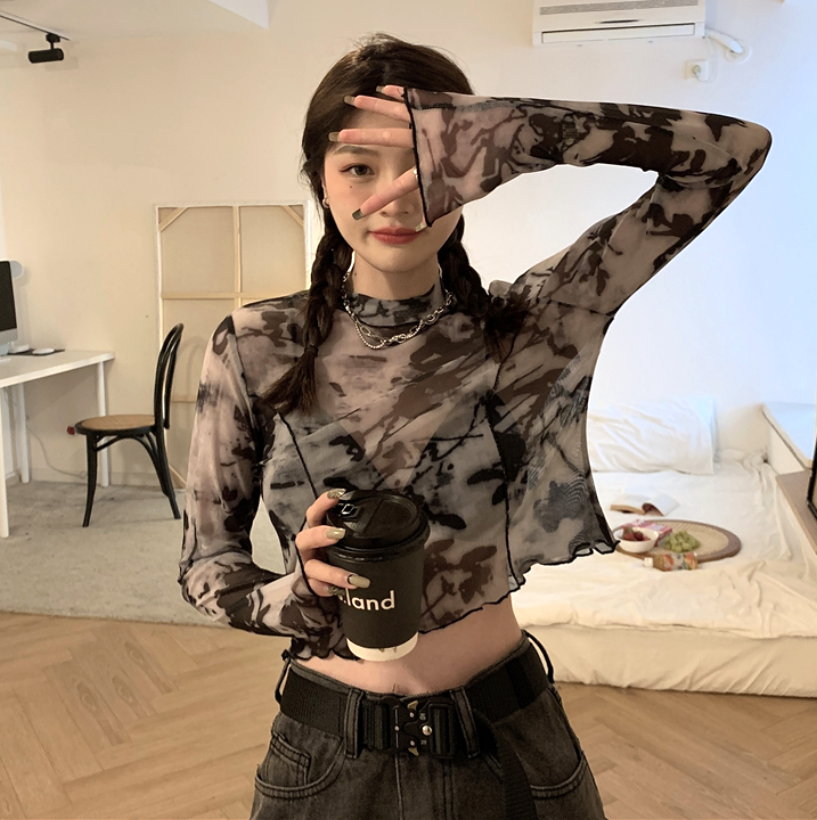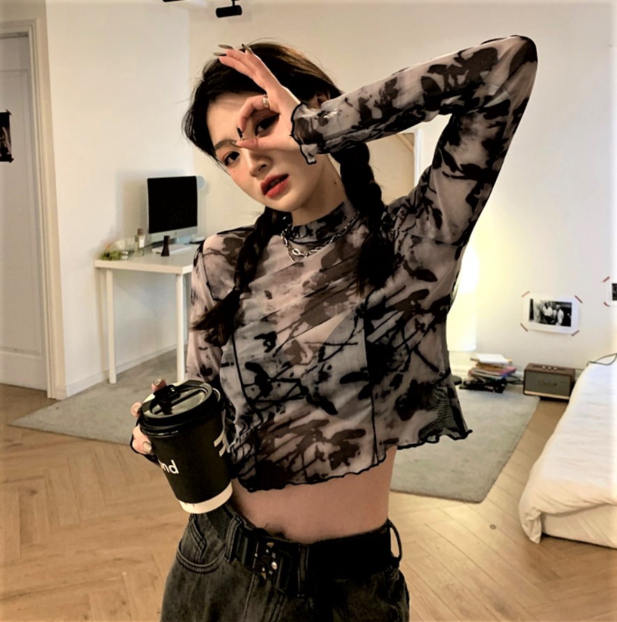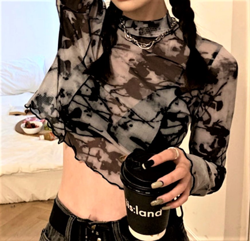 Vintage Ink Graphic Mesh Floral Lettuce Hem See Through Long Sleeve Sexy Slinky Stretch Top Blouse Y2K 90s Party Dancing Streetwear Amazing