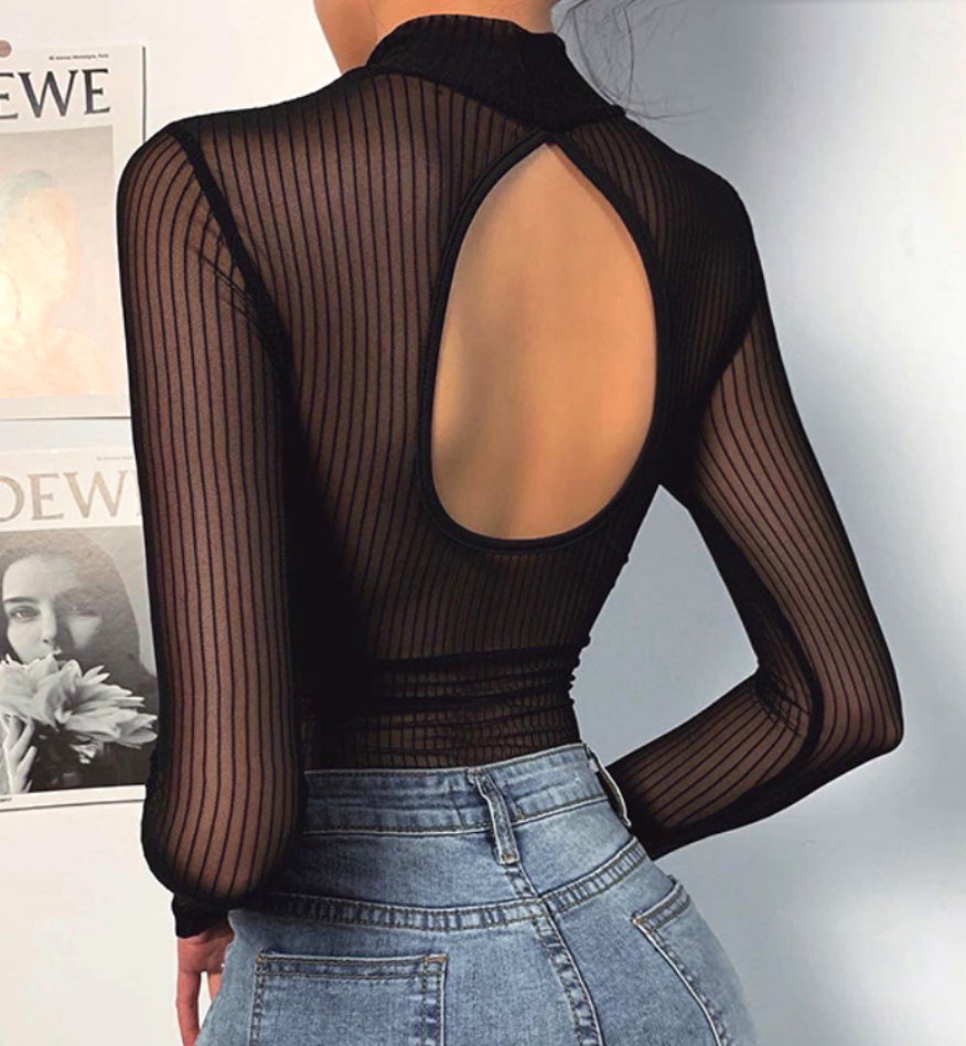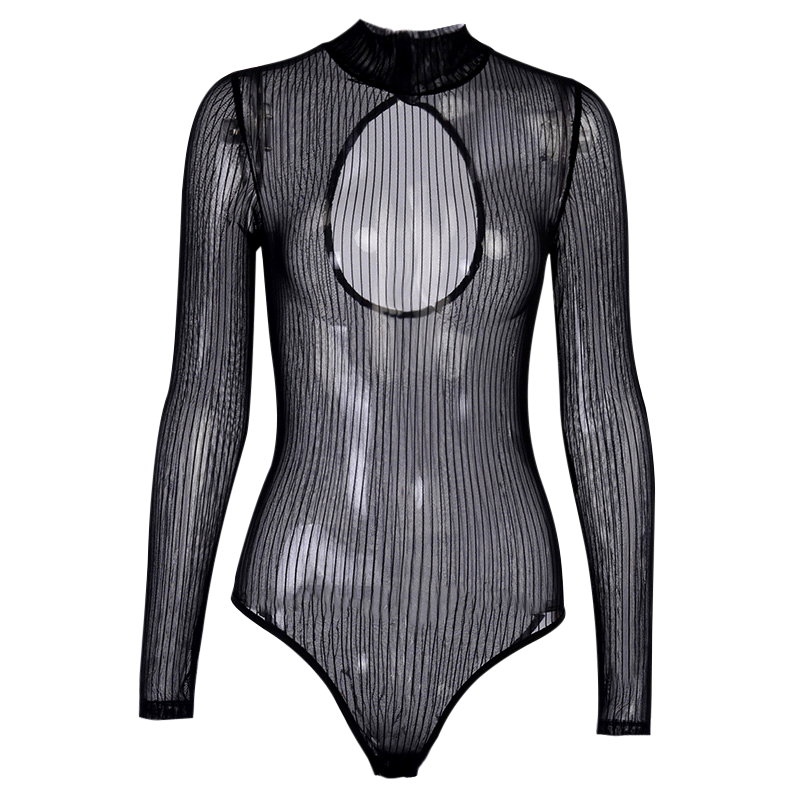Sexy Vintage Stripe Knit Fishnet See Through Turtle Neck Keyhole Back Long Sleeves Slinky Jumpsuit Tops Y2K 90s Highstreet Party Dance Barclub Amazing