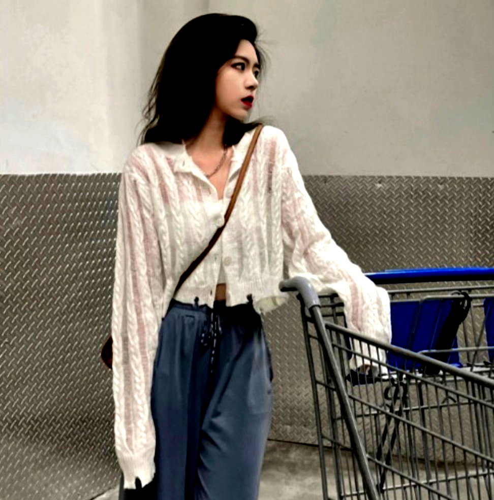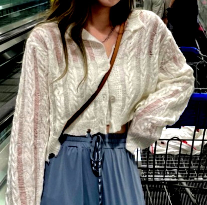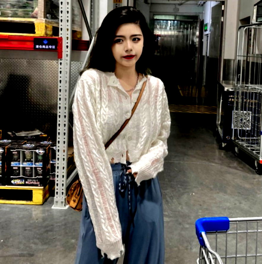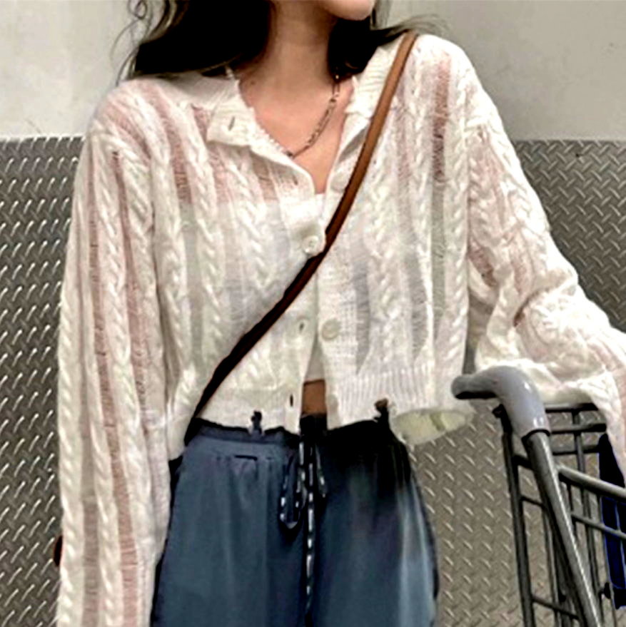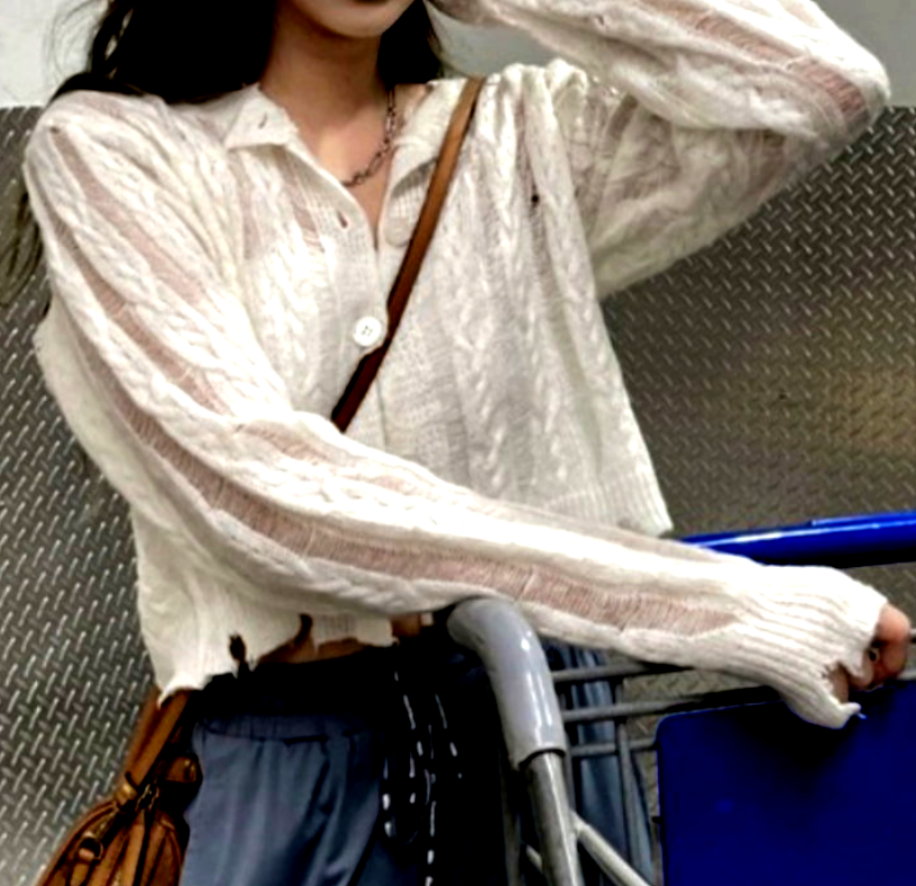 Sexy Ripped Hiphop Cable Twisted Stripe Jacquard Pattern Distressed Long Sleeves Thin Knitted Blouse