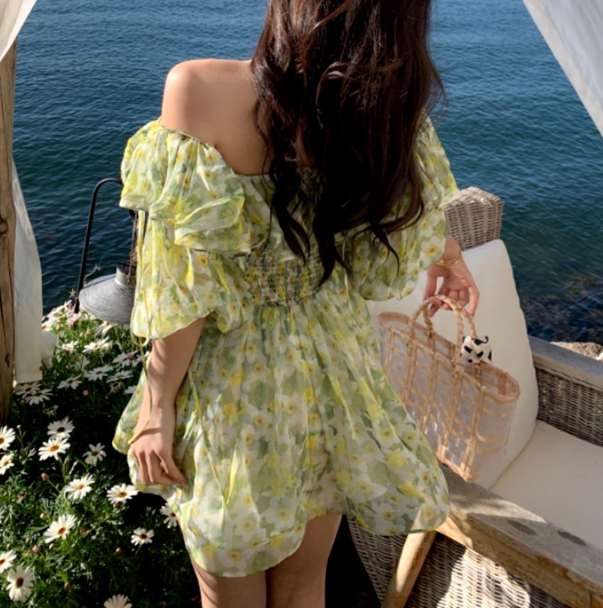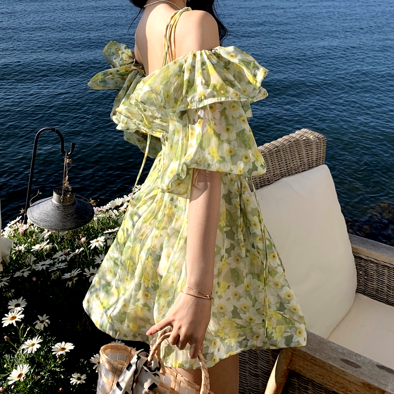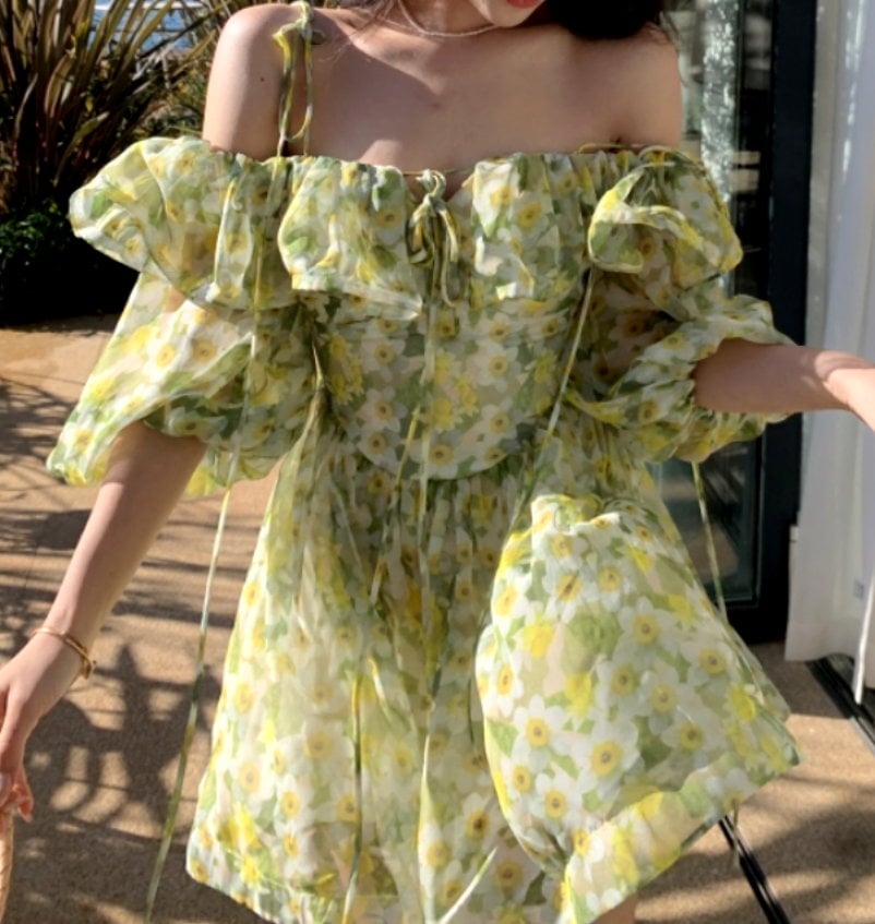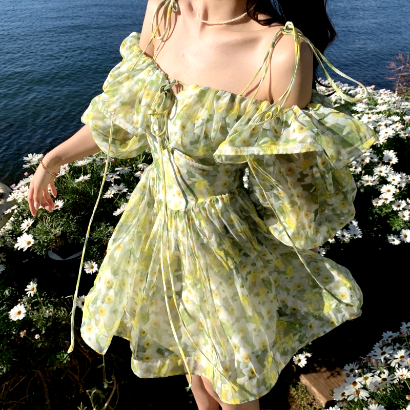 Vintage Adorable Prom Chiffon Spaghetti Shoulder Strap Drawstring Push Up Bustier Lantern Puffy Flare Sleeve Ruched Ruffle Dress