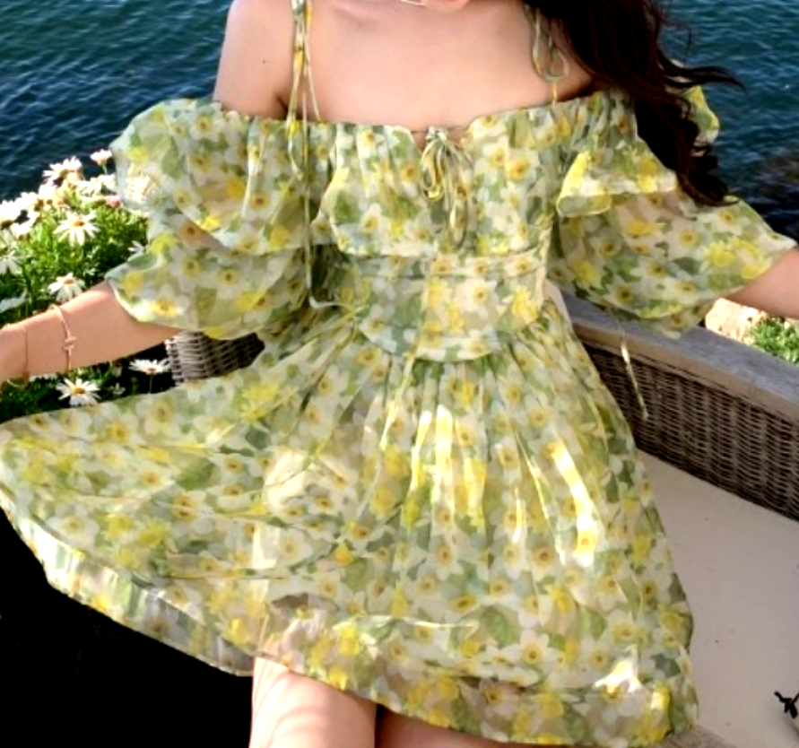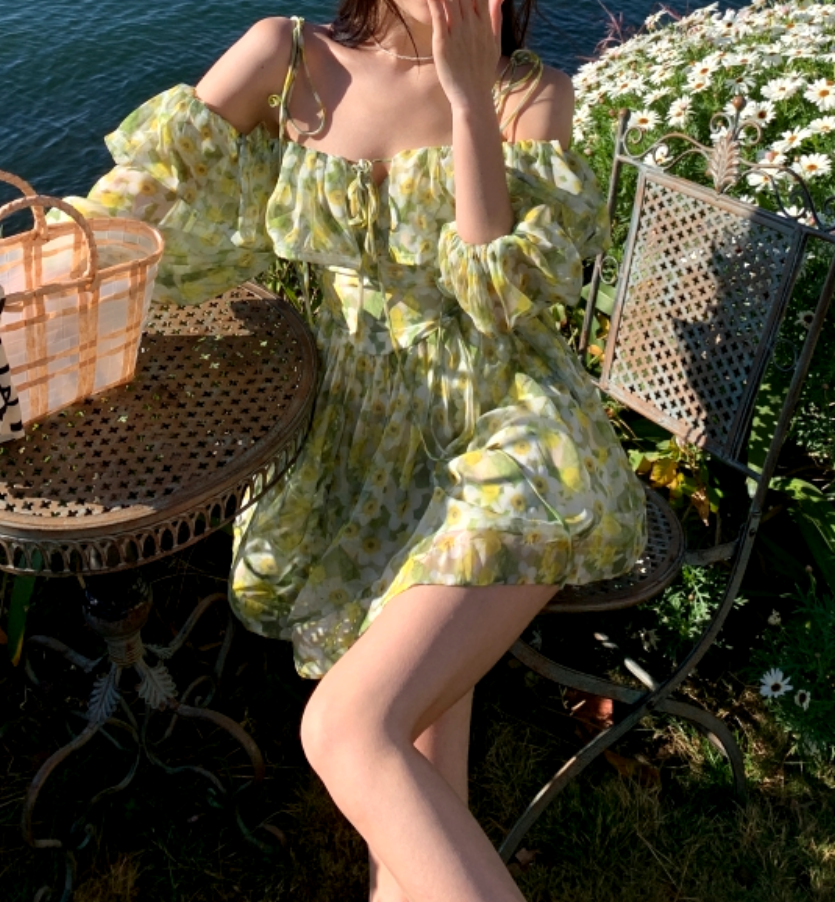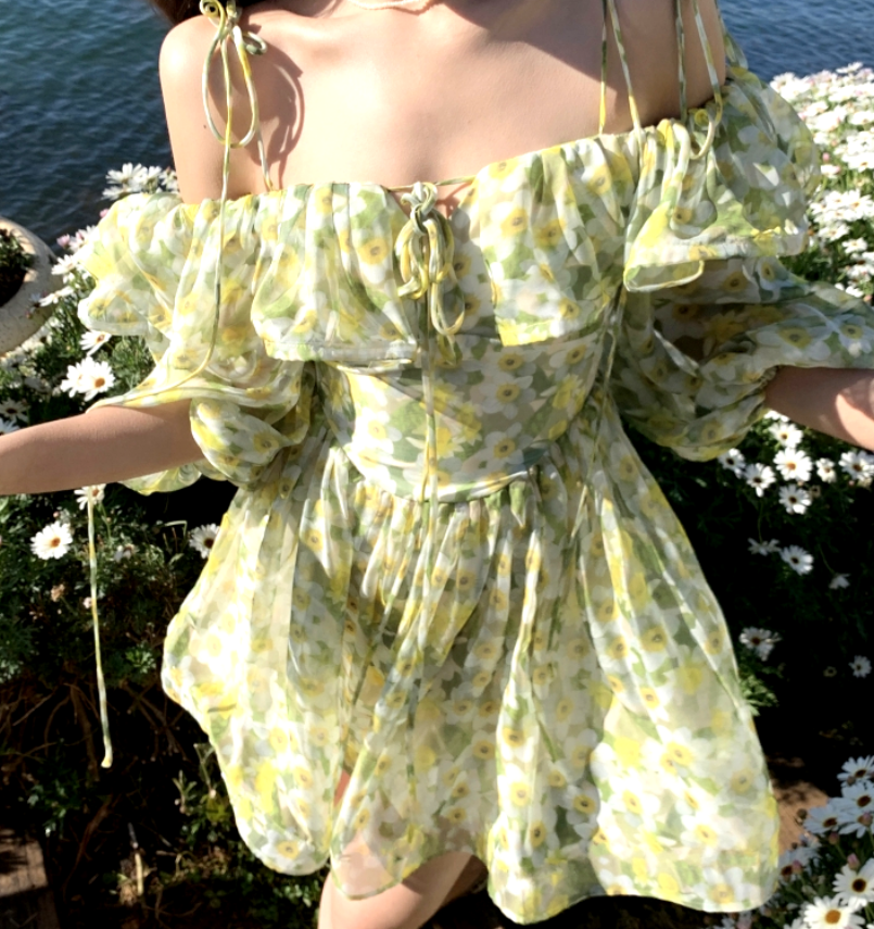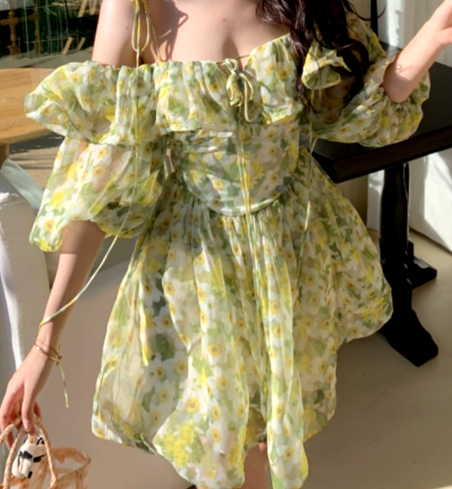 Vintage Adorable Prom Chiffon Spaghetti Shoulder Strap Drawstring Push Up Bustier Lantern Puffy Flare Sleeve Ruched Ruffle Dress Y2K Streetwear Party Prom Event Coolest Style Amazing