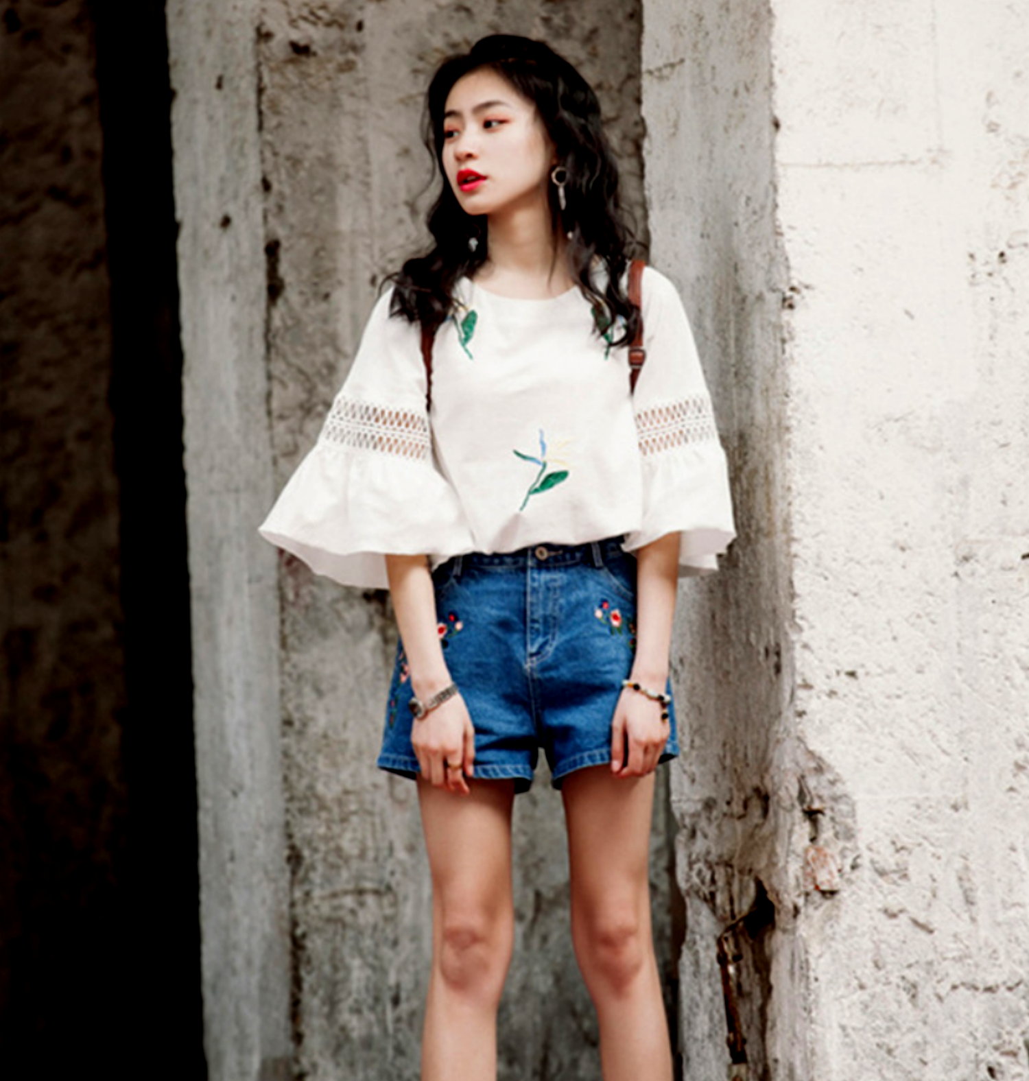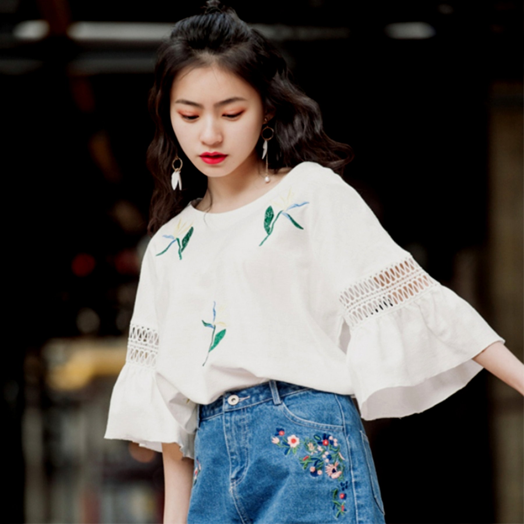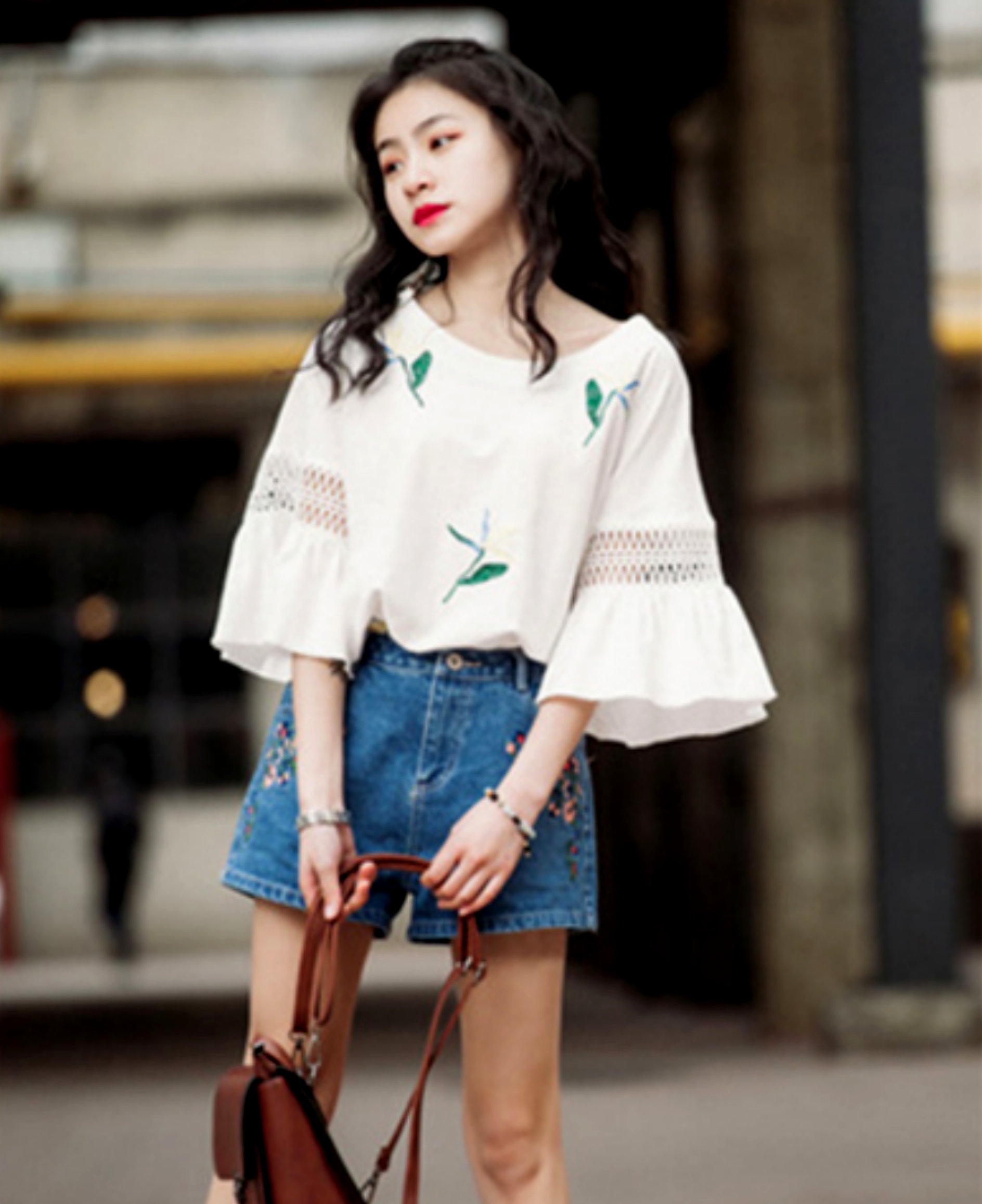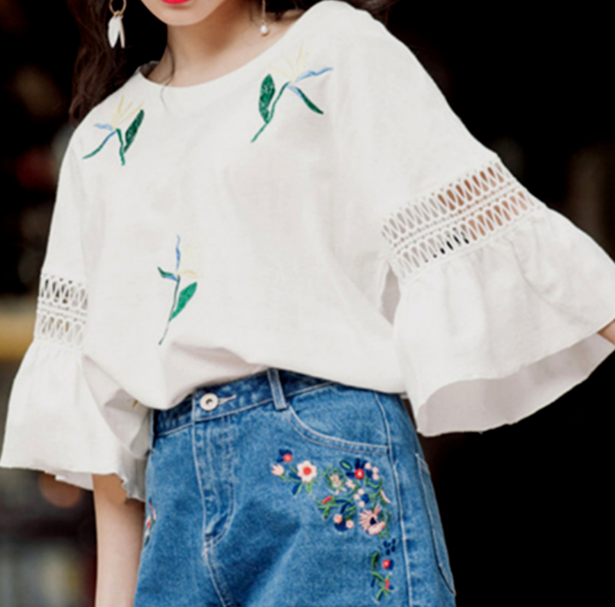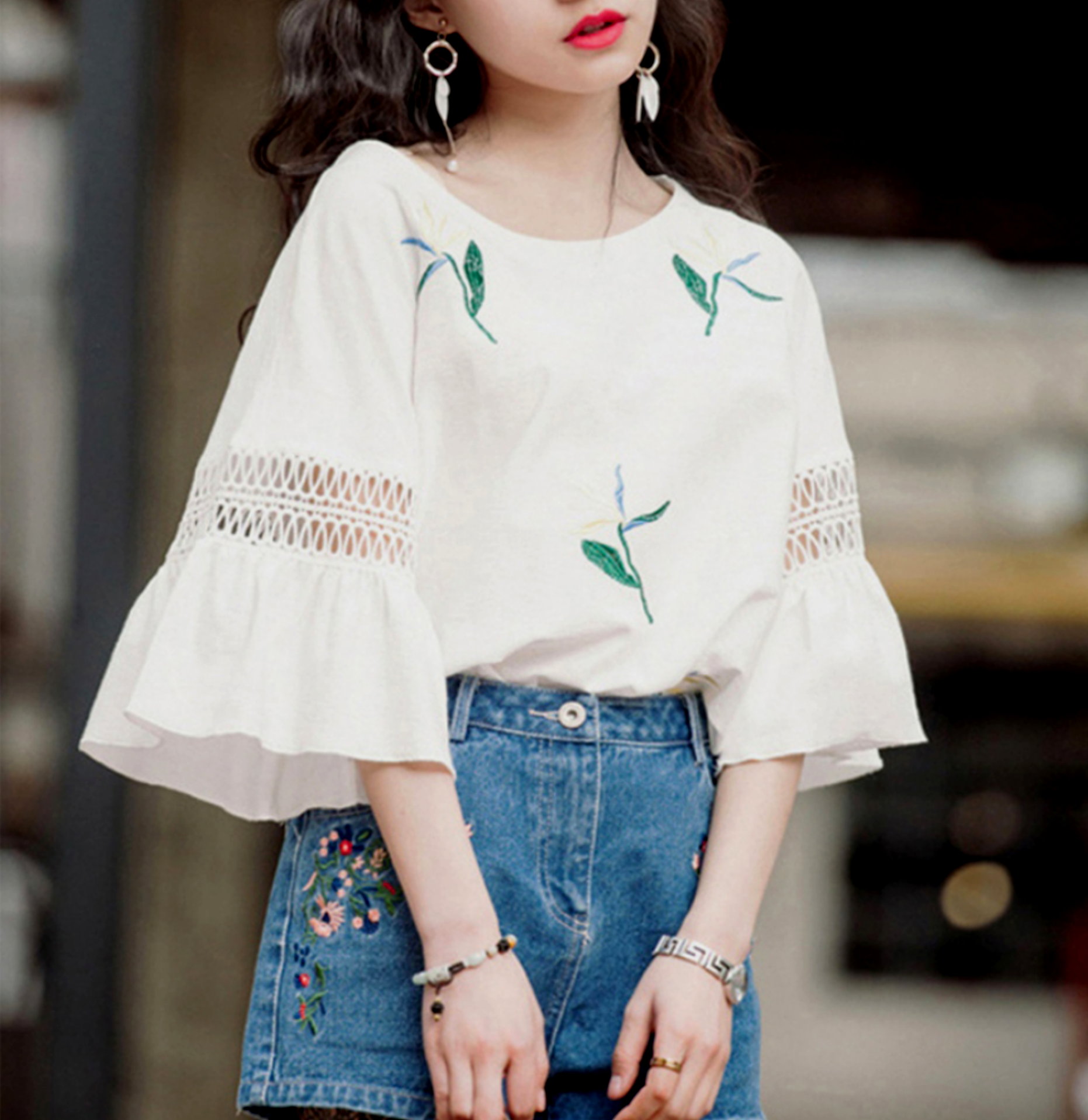 Vintage Adorable Hollow Embellished Lantern Puffy Flare Sleeve Ruched Ruffle Tops