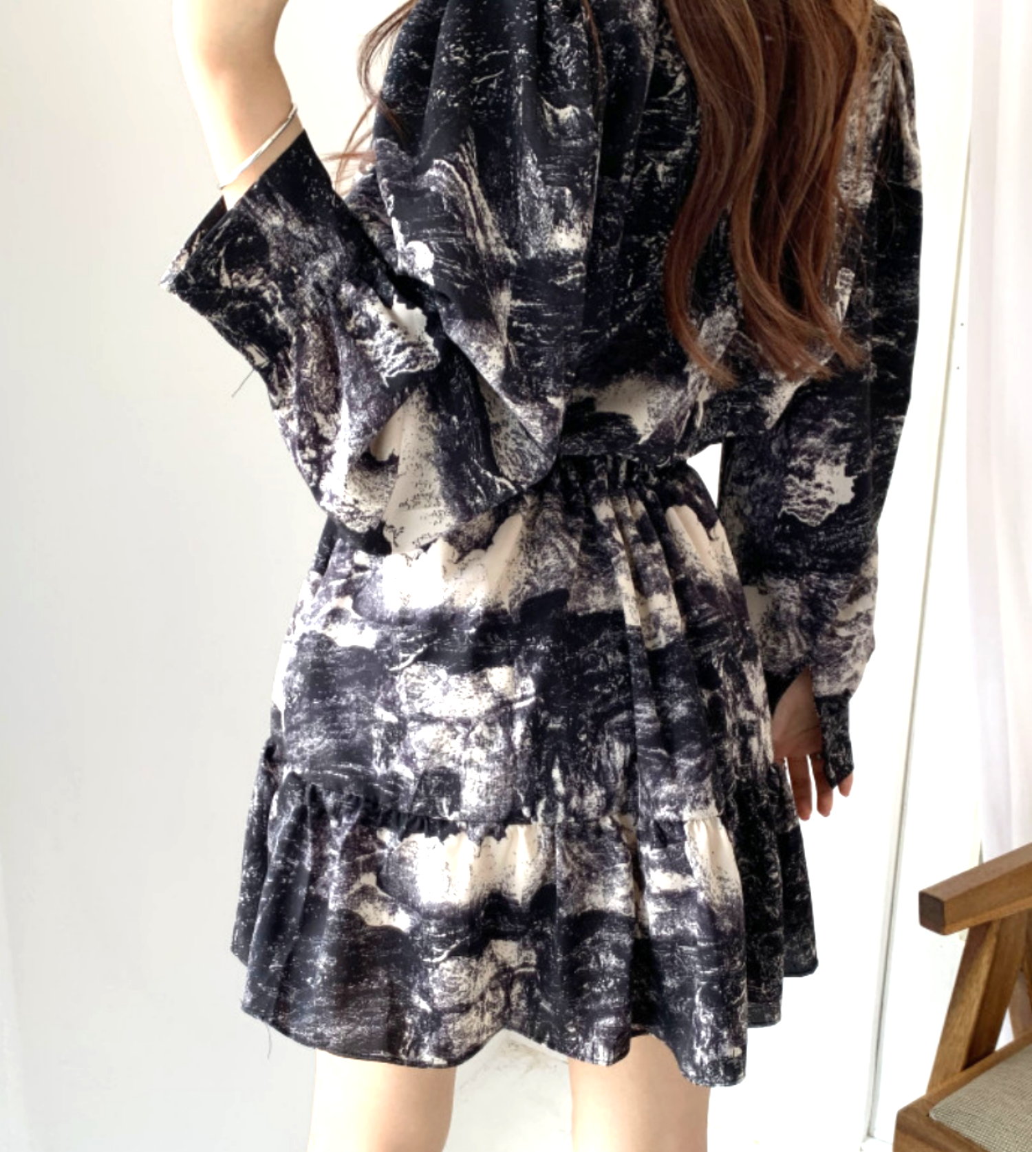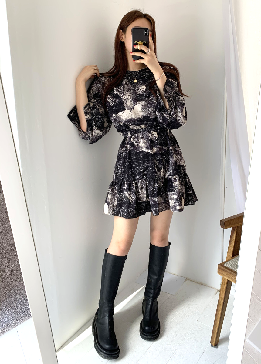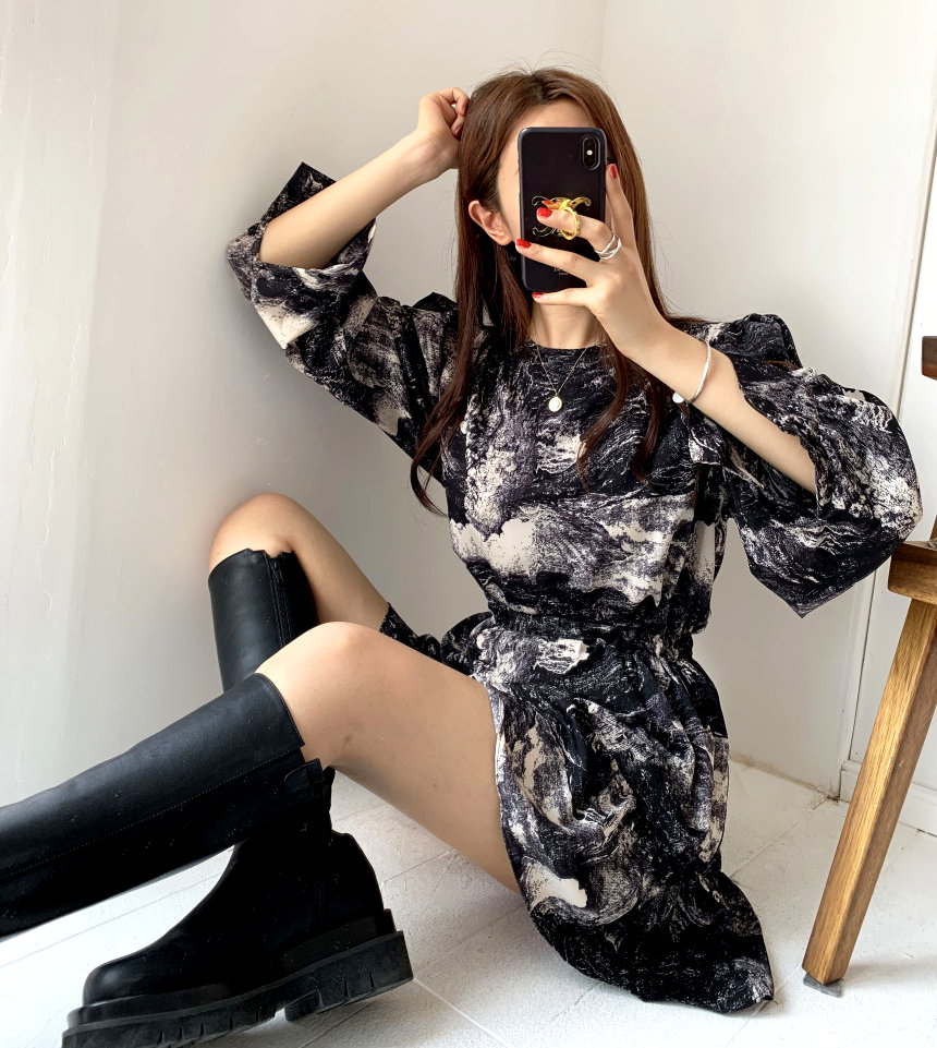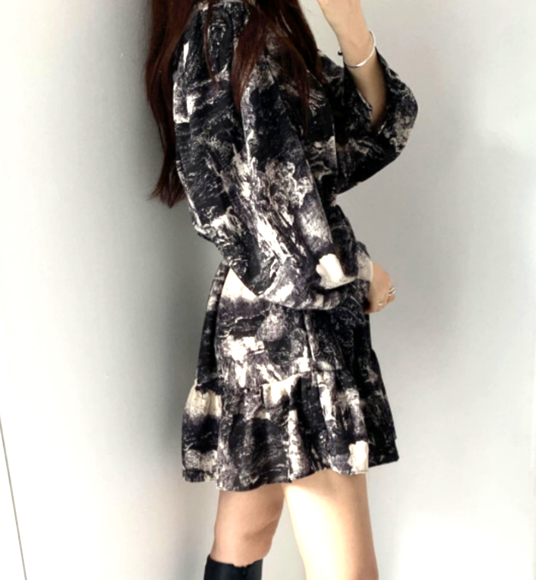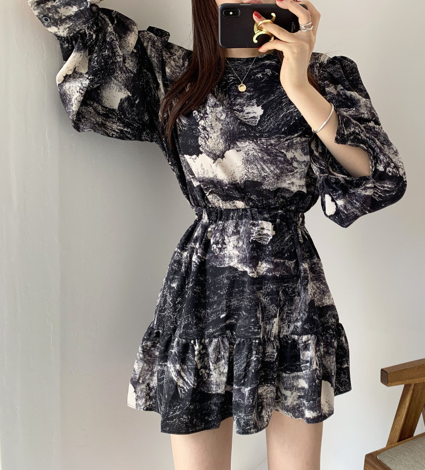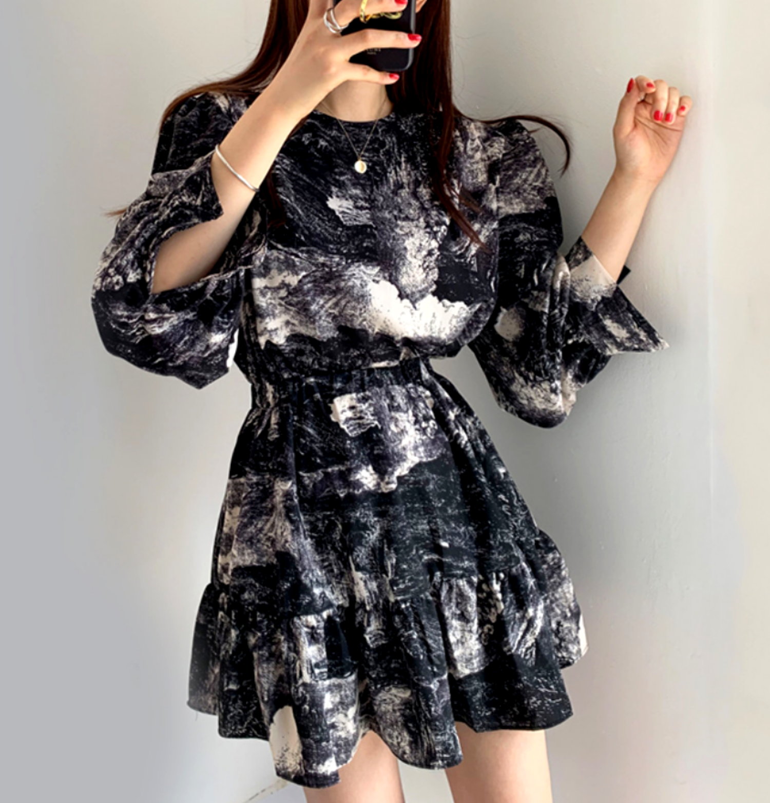 Vintage Adorable Graphic Ink Prints Lantern Puffy Sleeve Ruched Ruffle Dress