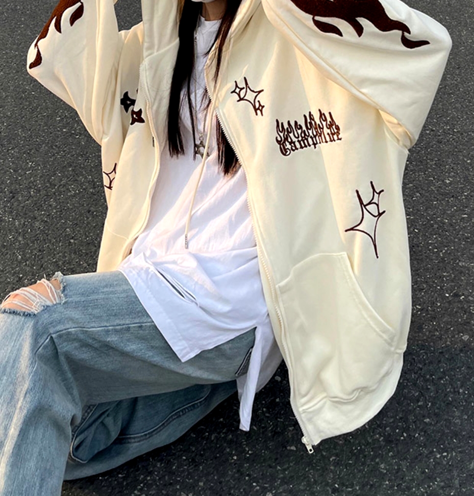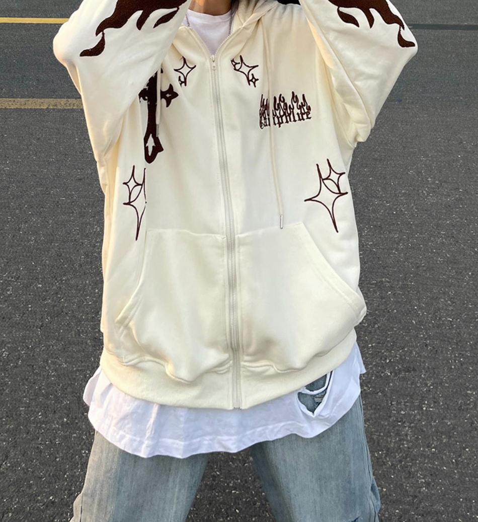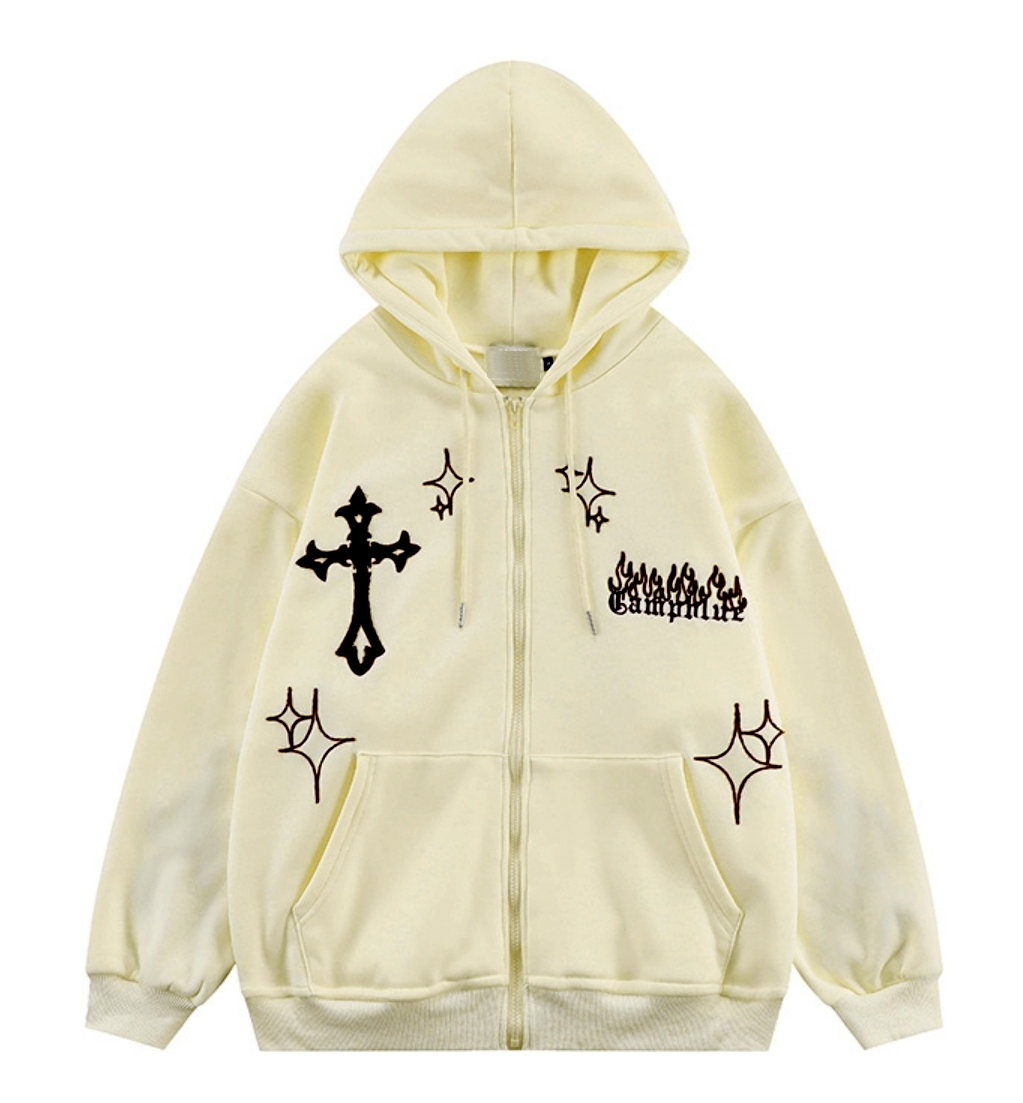 Vintage Goth Cross Embroidery Zipper Oversize Hippie Hoodie Jacket Streetwear