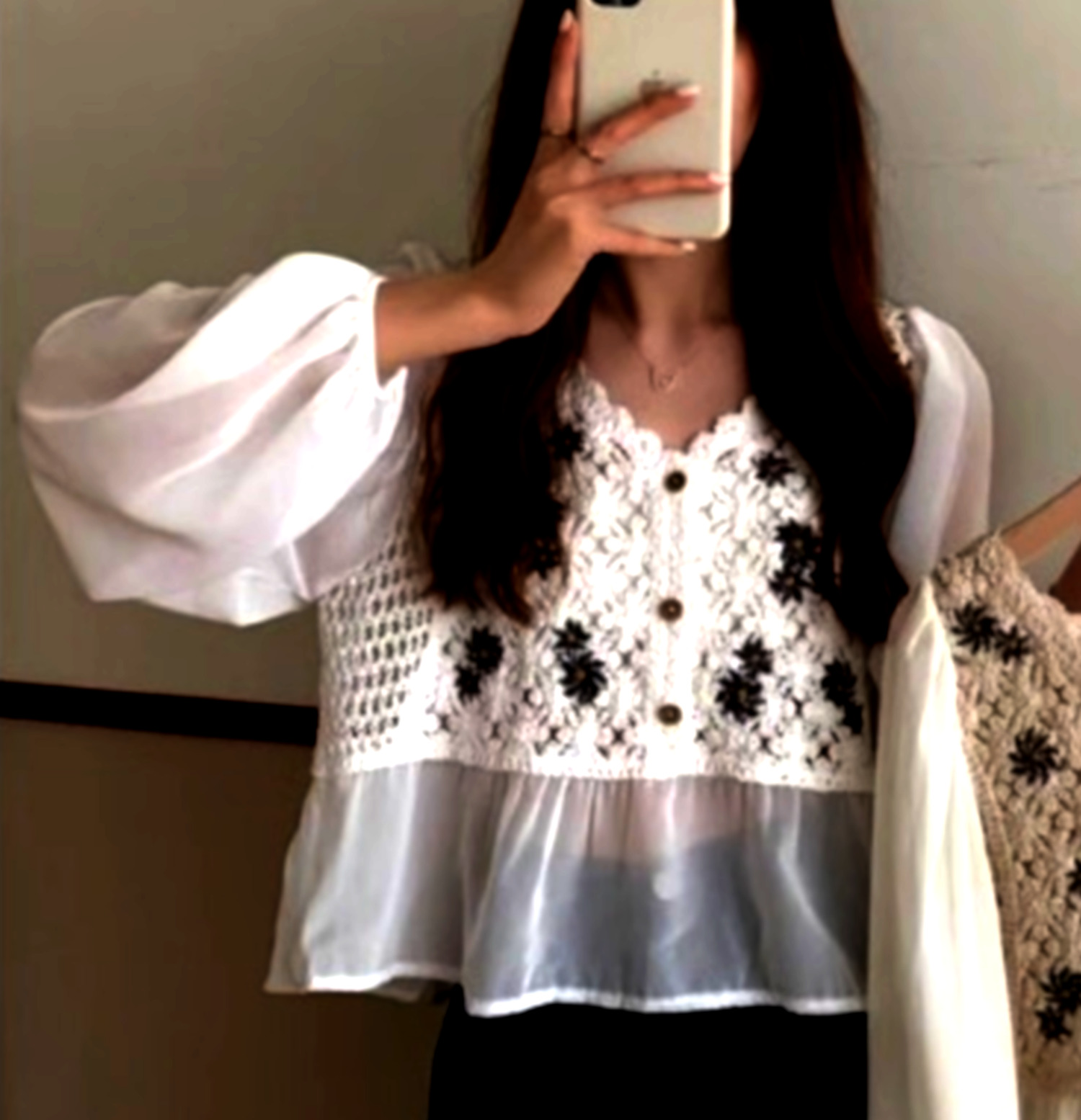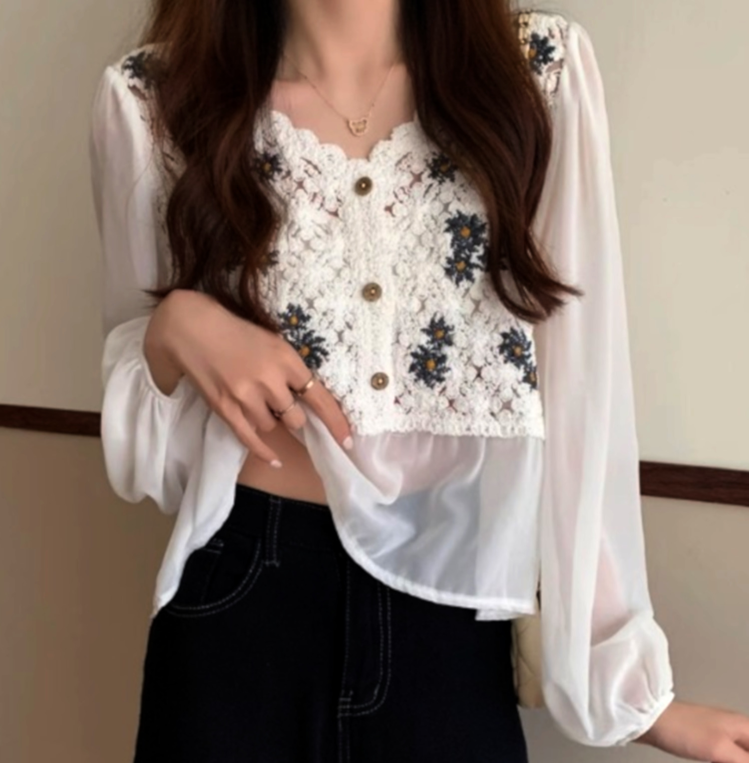 FREE SHIP! Vintage Boho Chiffon Patchwork Knit Emboidery Ruffle Lantern Sleeves Loose Fits Blouse Tops Unique