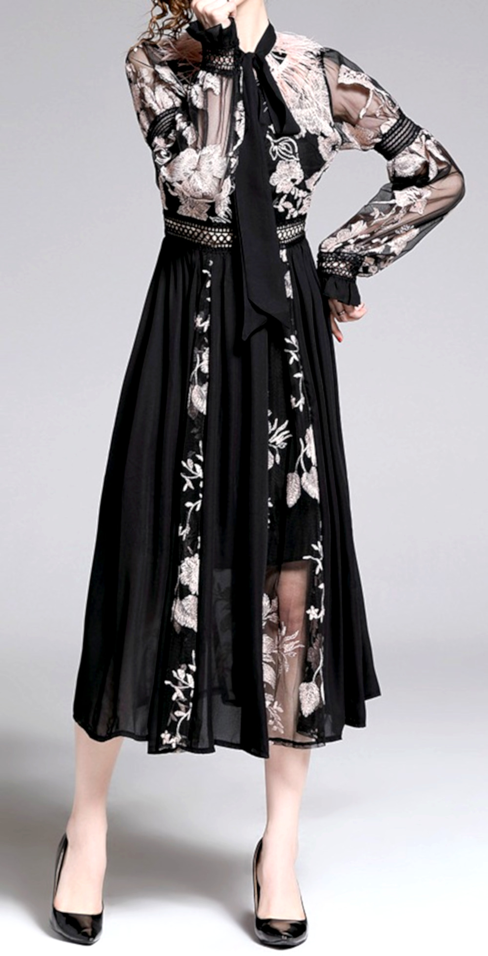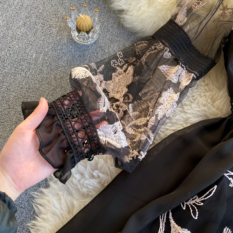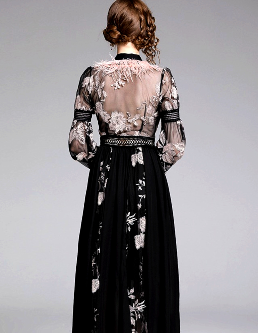 Stunning Goth French Floral Embroidery Lantern Sleeves Chiffon Mesh Layered Ruffle Dress Evening Party Event Special Occasion Amazing