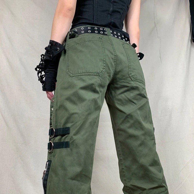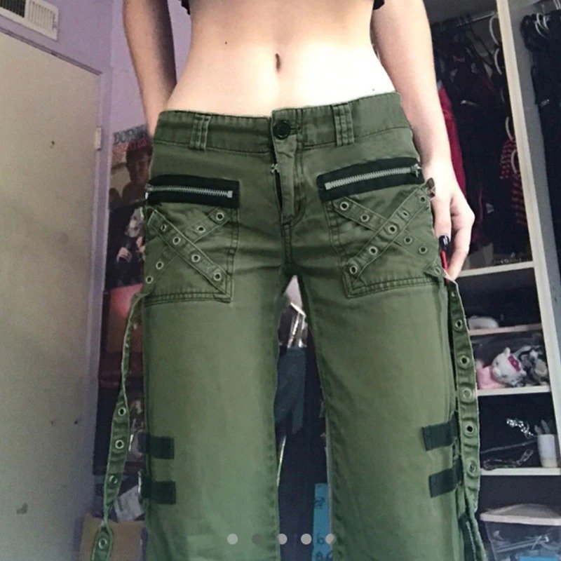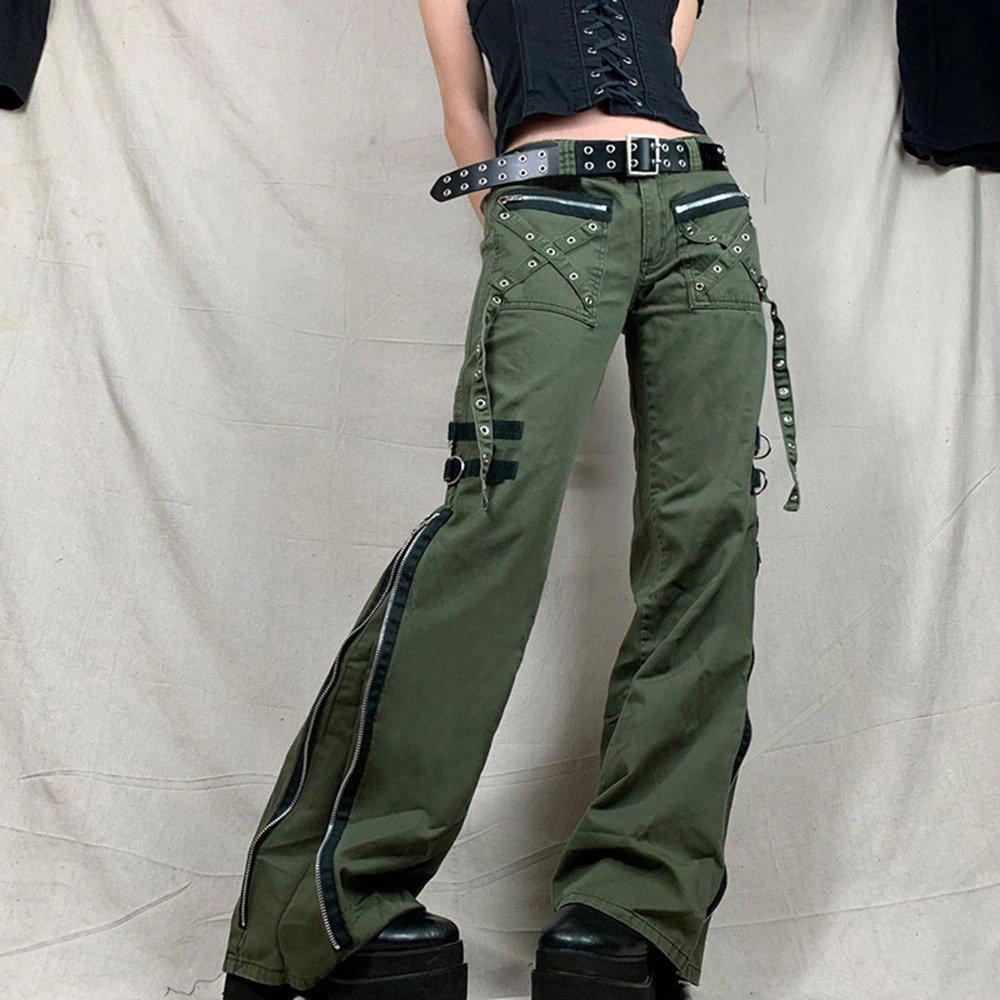 Punk Goth Cross Straps Rivets Eyelet Zippers Side Fly Slit Low Waist Flare Trousers Streetwear Rave