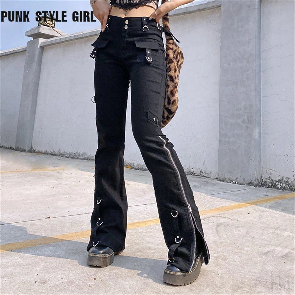 Vintage Punk Goth Buckle Rings Rivets Eyelet Side Zippers Fly Slit Flare Cargo Trousers Streetwear Rave